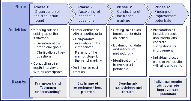 Workshops are organised to give the participants the chance to share their experiences and best practice examples with peers. The benchmarking makes possible a discussion based on comparable and comprehensible figures. In general, only costs (total costs and, separately, influenceable costs) and not prices are considered. An important aspect for all the areas is to take into account the different histories and factors by using appropriate complexity correction factors.